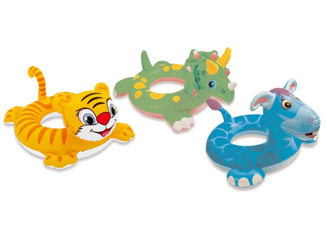 Веселый надувной детский круг яркой расцветки в виде различных забавных существ: динозаврик, тигренок, ослик.