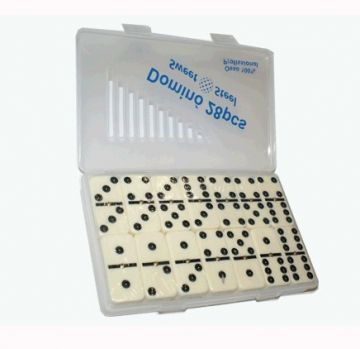 Домино большое в пластмассовой коробочке, белое с шариком, облегчающим перемешевание костяшек на столе