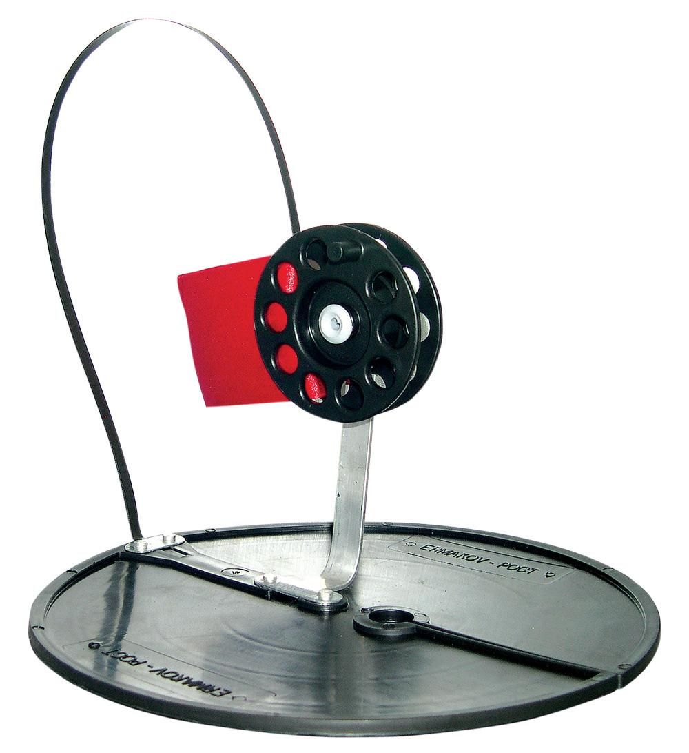 Катушка свободно крутится на оси и при установке жерлицы фиксируется пружинкой из плоской металлической пластины или проволоки с флажком-сигнализатором на конце.