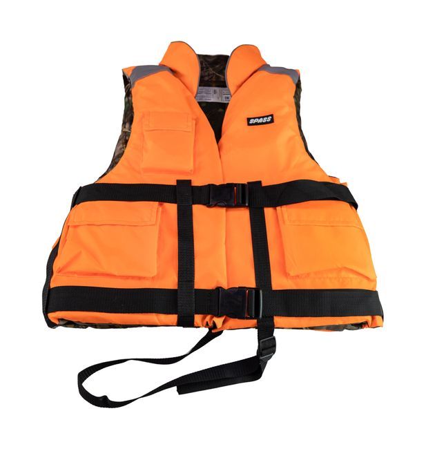 Спасательный жилет «Командор» для рыбалки и охоты. С лицевой стороны жилет ярко-оранжевый, с обратно – камуфлированной расцветки.