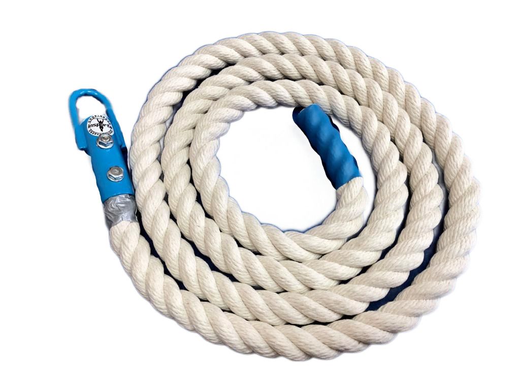 Свойства: длина: 2,5 м, диаметр: 30 мм. Материал: хлопчатобумажная пряжа. Для подвески каната служит стальная петля, закреплённая в металлических щеках одного из концов каната. На другом конце каната закреплён декоративный чехол. Канат для лазания предназначен для общефизической подготовки учащихся в спортивных залах.