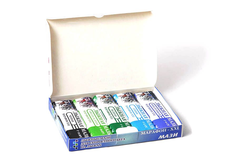 Предназначена для смазки скользящей поверхности.Комплект для пяти температурных режимов. Комплект лыжной мази из 5 брусков для разных температурных режимовФиолетовая ( от 0 ° до -2 °C) Полутвердая. На старый и новый снег.Синяя ( от -2 ° до -8 °C) Твердая. На старый и новый снег. Зелёная ( от -5 ° до -12 °C) Твердая. На старый и новый снег. Светло-зеленая ( от -10 ° до -25 °C) Твердая. На старый и новый снег.Чёрная. ( от -15 ° до -30 °C) Твёрдая. На очень холодный и порошкообразный снег.