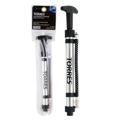 Насос двойного действия "TORRES", длина 20 см, корпус из высокпрочного и легкого алюминиевого сплава, в комплекте игла (5мм) для накачивания мячей (в ручке насоса) и гибкий шланг.