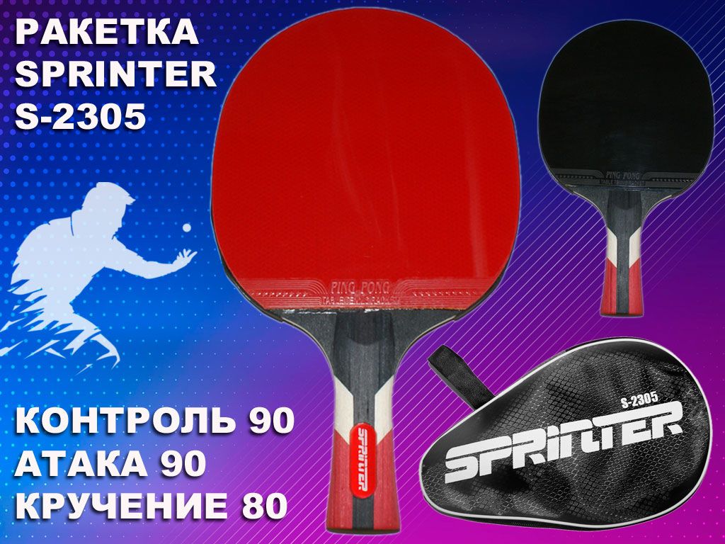 акетки SPRINTER для игры в настольный теннис. Такая ракетка отлично подходит для игроков стремящихся найти свой стиль игры и усовершенствовать навыки. Она помогает игрокам контролировать направление и скорость мяча, а также обеспечивают комфортное и удобное манипулирование мячом. Ручка ракетки удобной форма и не доставляет дискомфорта во время игры. Основание ракетки полностью изготовлено из дерева. Накладка состоит из двух слоев: губчатого внутреннего слоя и наружного из специальной резины с обеих сторон. В комплекте удобный чехол для хранения и транспортировки ракетки.